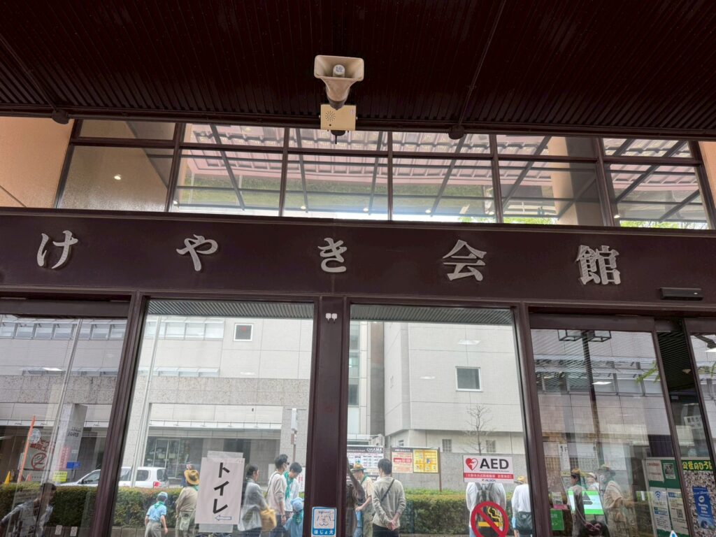 市役所前でおにいさん、おねえさんが集合したよ!!旗がいっぱいたってる~。ビーバー隊は、いつものけやき会館に集合